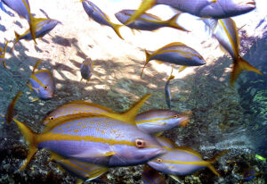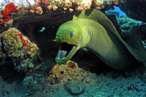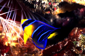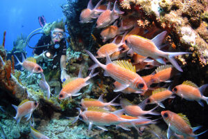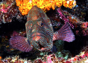 The reefs of the BVI hold hundreds of species and every dive is a different census. At the Indians, clouds of grunts and goatfish move as one through the arch. At Painted Walls, fairy basslets hover upside-down against the ceiling of a swim-through, pink and purple against the dark. At Blonde Rock and Alice in Wonderland, the bigger fish patrol — tarpon, horse-eye jacks, the occasional cubera snapper with a jaw like an old lawyer’s.